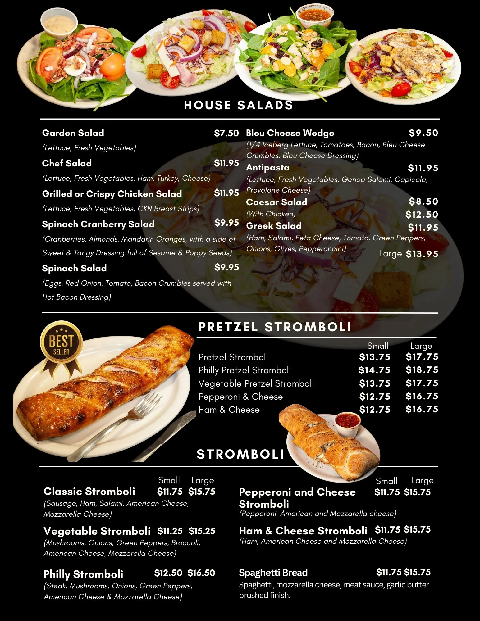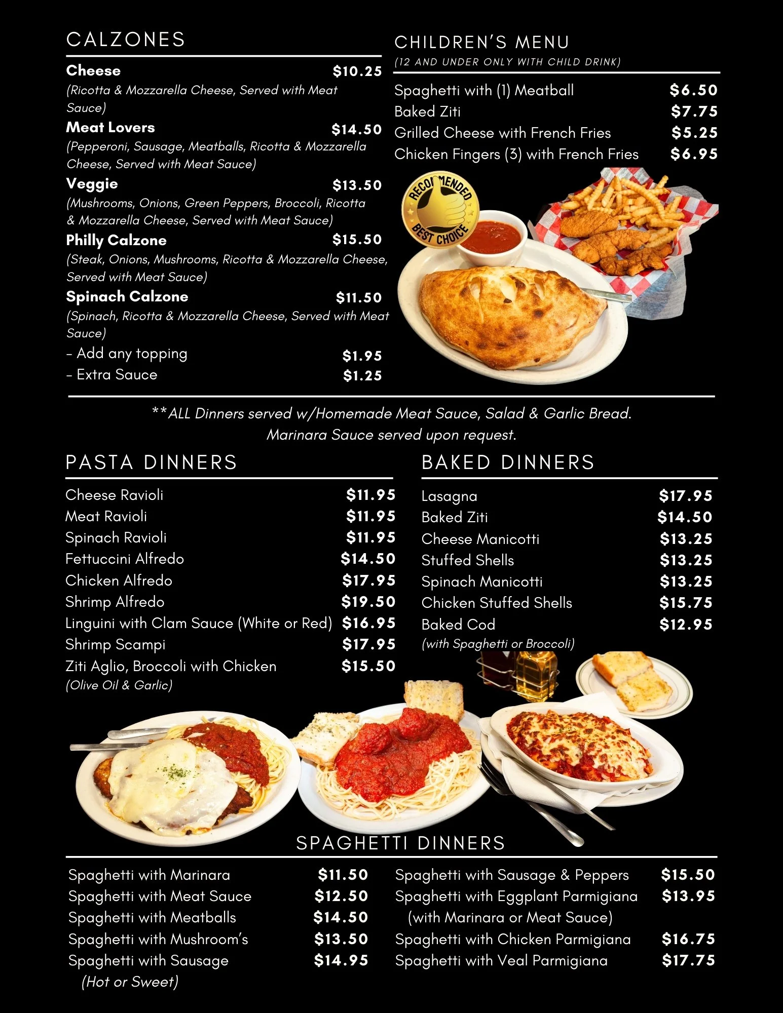 This is the full board. New York-style pizza, baked pasta, stacked subs, wings, calzones, and classic Italian